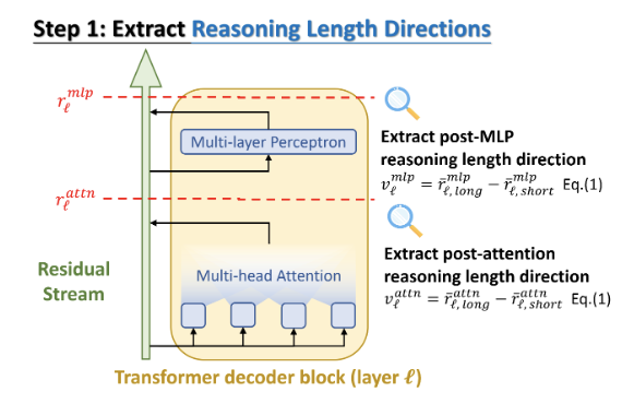 \[\begin{align} r_{\ell}^{\text{attn}} &= r_{\ell-1}^{\text{mlp}} + \text{Attn}(\text{LayerNorm}(r_{\ell-1}^{\text{mlp}})) \\ r_{\ell}^{\text{mlp}} &= r_{\ell}^{\text{attn}} + \text{MLP}(\text{LayerNorm}(r_{\ell}^{\text{attn}})) \end{align}\]The direction of interest at layer \(\ell\), for example the reasoning length direction, is computed as the vector difference of two contrasting embeddings (e.g. “long” and “short” embeddings):